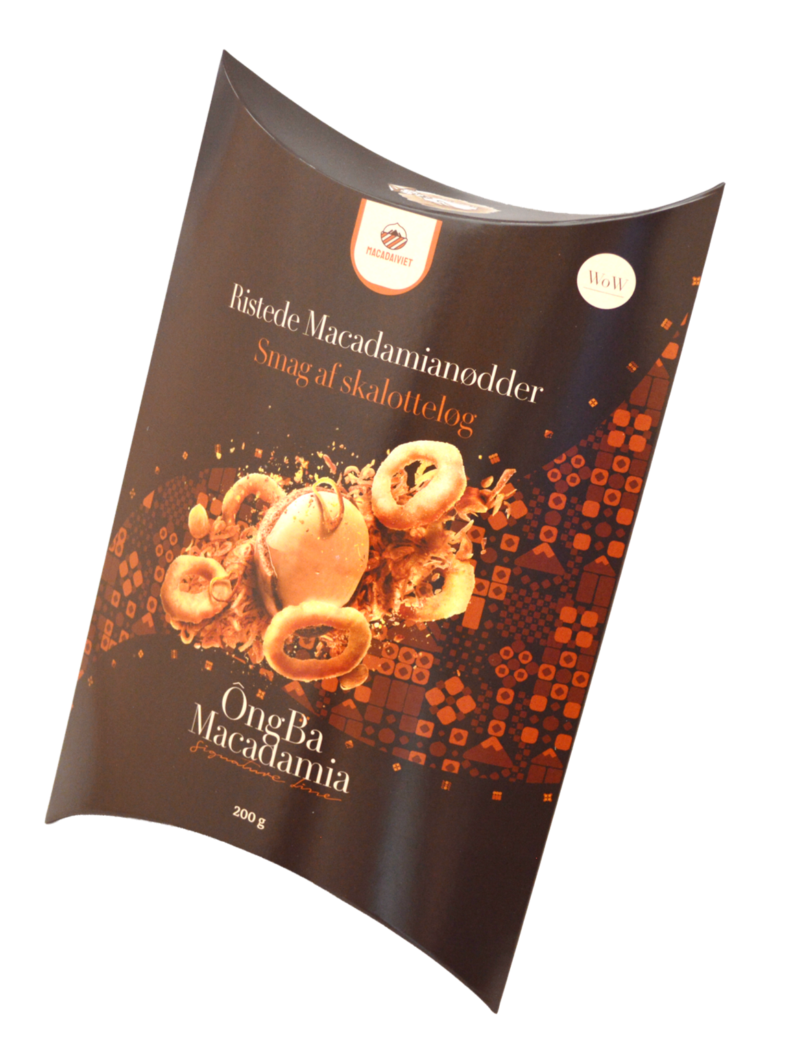 MACADAMIANØDDER (95 %), hvidløg- og skalotteløg krydderiblanding, salt, vegetabilsk olie.